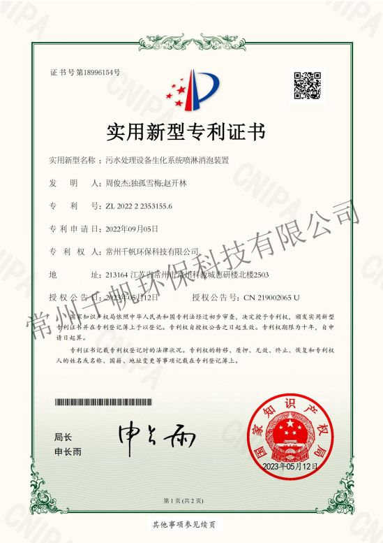 實(shí)用新型專利證書(shū) 污水處理設(shè)備生化系統(tǒng)噴淋消泡裝置